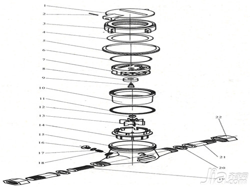 1-表蓋;2-軸銷;3-銅罩;4-罩子襯墊;5-表玻璃;6-O形密封圈;7-計數器;8-防磁環;9-中心齒輪,10-齒輪盒;11-墊圈;12-磁鋼座;13-葉輪;14-葉輪盒;15-表殼;16-調節螺釘;17-調節螺釘墊片;18-調節塞;19-濾水網;20-接管墊片;21-接管;22-連接螺母
